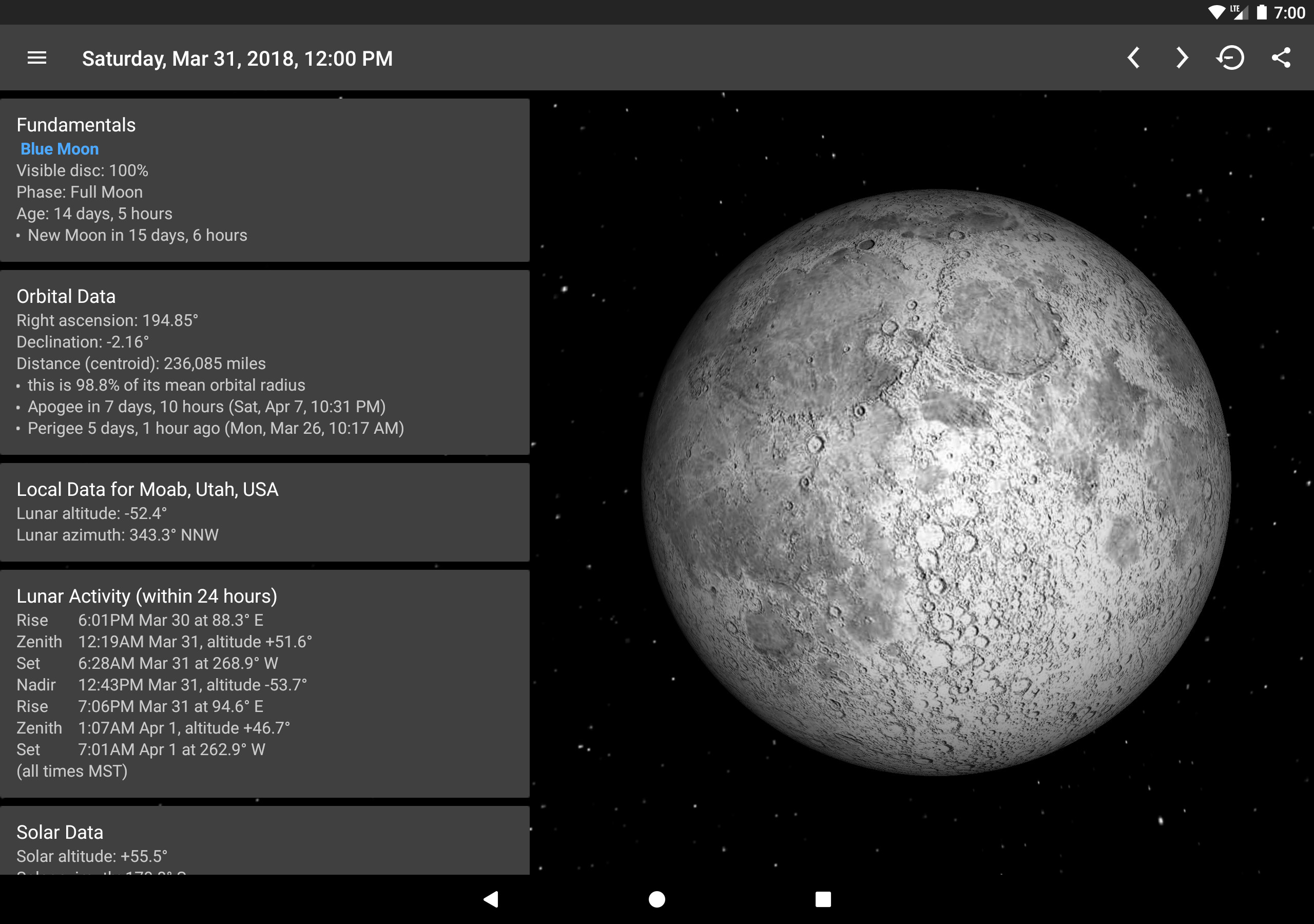 Like the rest of the app, the Data page can easily be switched to show another day, or a different observer location anywhere on Earth. Want to know when the moon will rise on New Year's Day in Fiji? No problem.